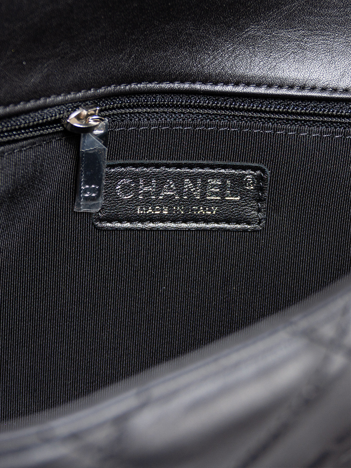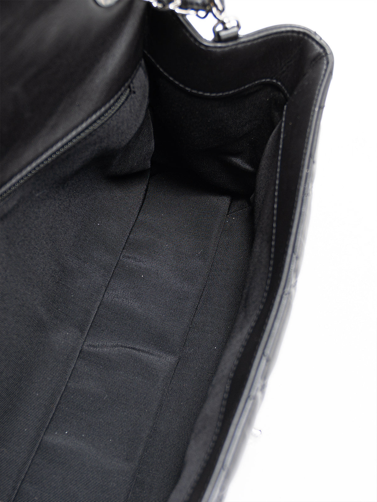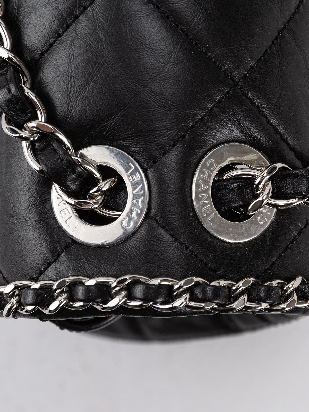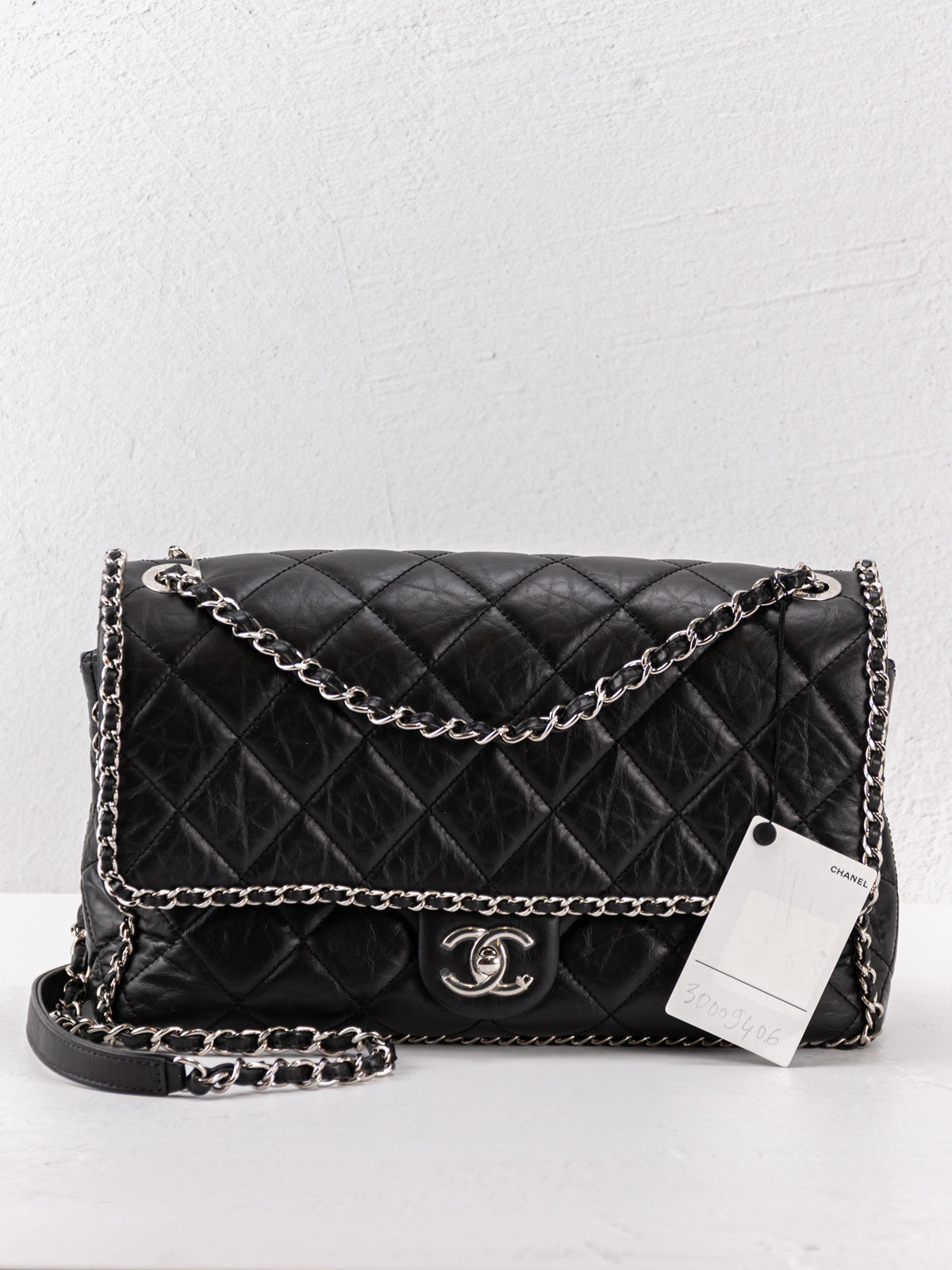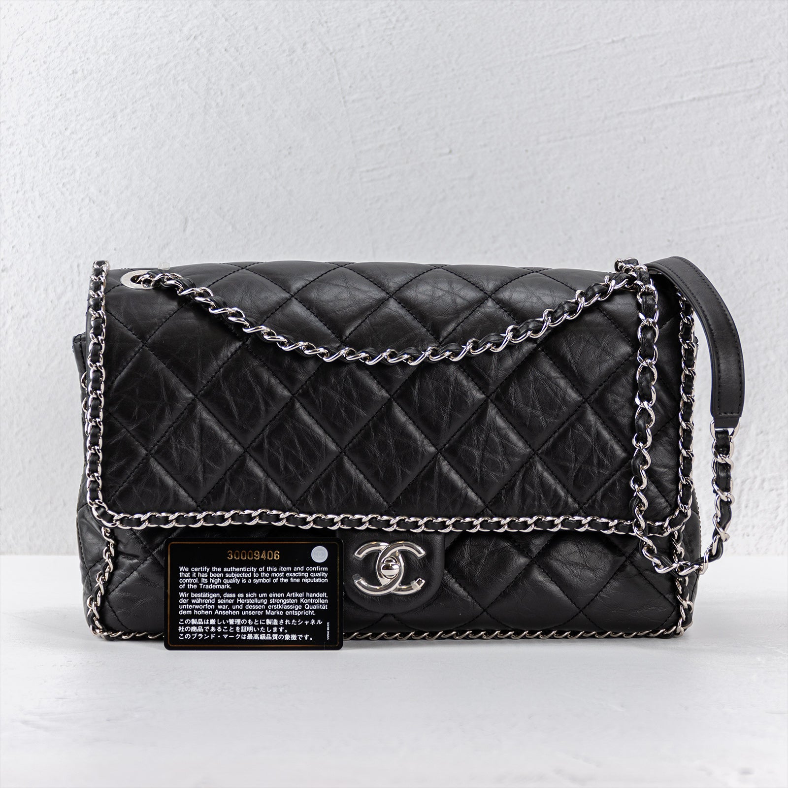 This Chanel Medium Running Chain Around Flap Bag is crafted from black quilted Crumpled Calfskin, with silver-tone hardware and chain-link shoulder strap. Grosgrain lining with zipper pocket at interior and turn-lock closure at front. Includes tags.