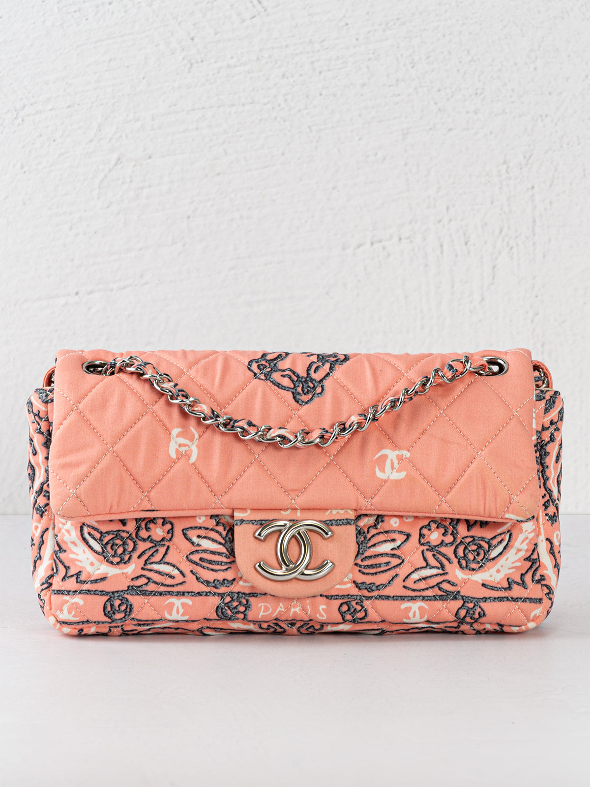 This Chanel Small Bandana Flap Bag is crafted from pink canvas, with silver-tone hardware and chain-link shoulder strap. Grosgrain lining with zipper pocket at interior and magnetic snap closure at front. Includes dust bag. From the 2008-2009 collection by Karl Lagerfeld.