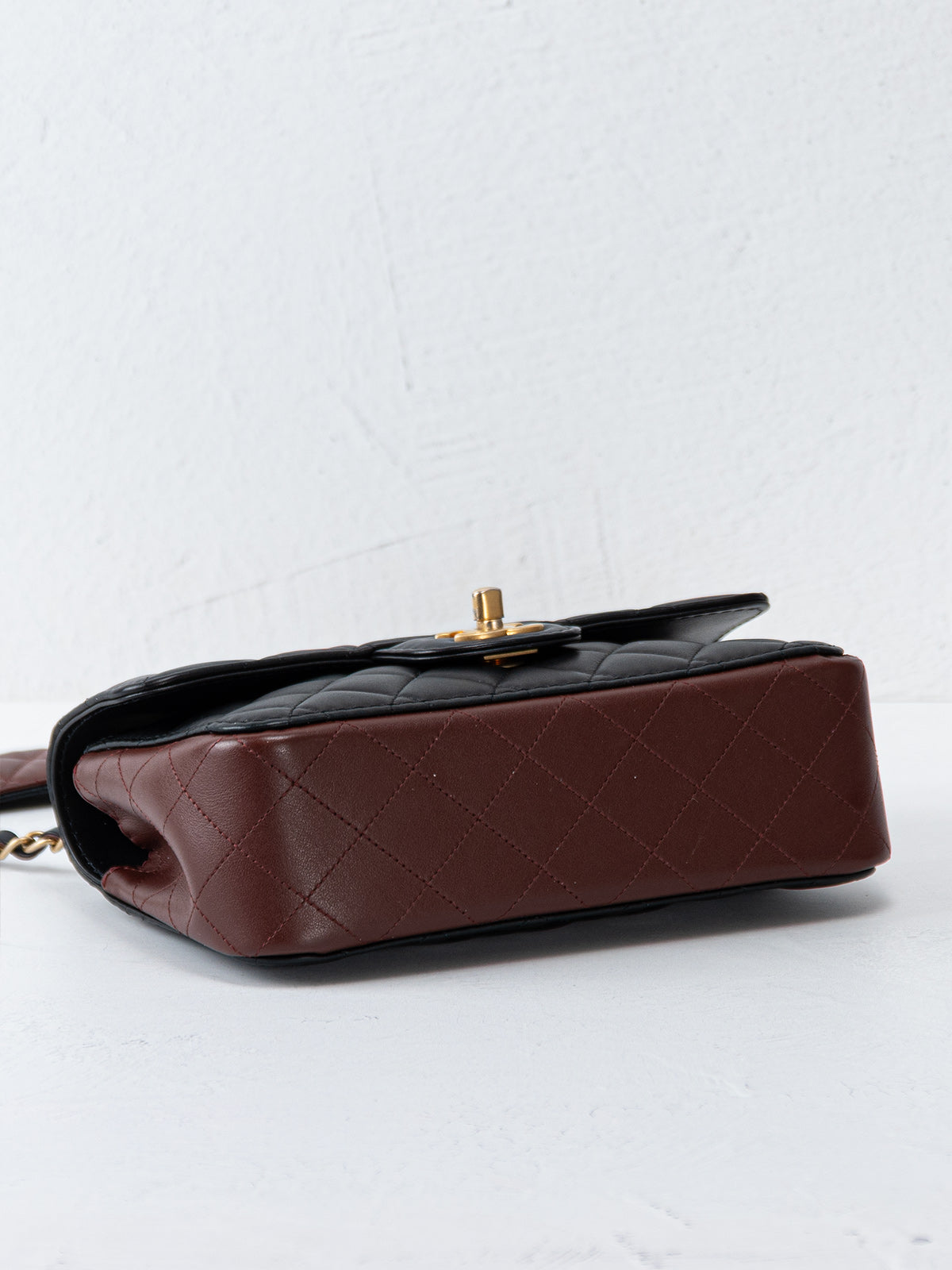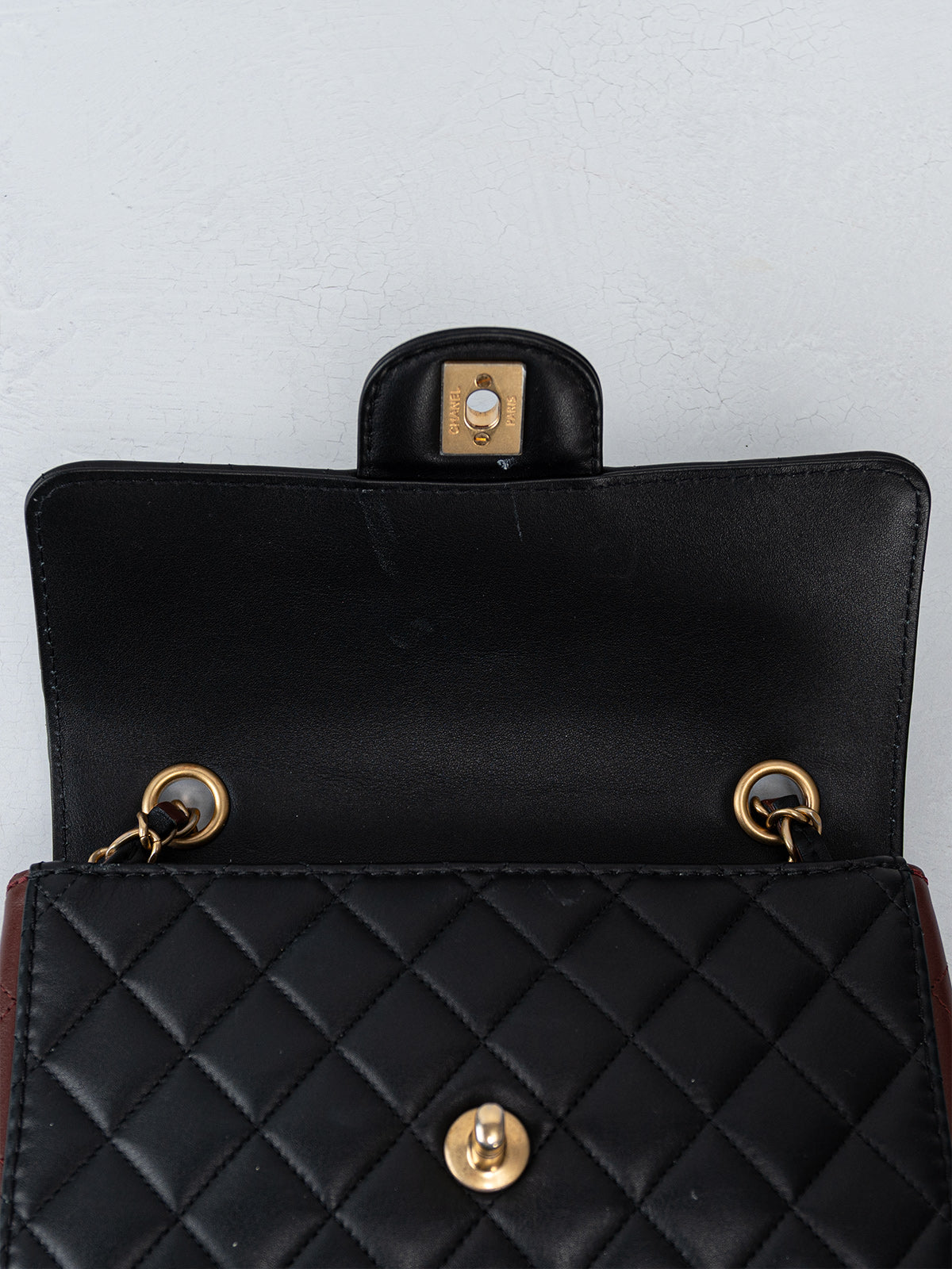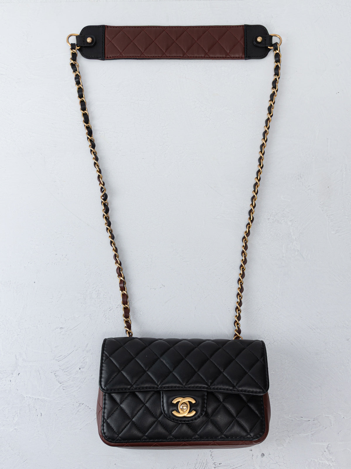 This Chanel Small Strap Into Flap Bag is crafted from black Calfskin leather with aged gold-tone hardware and chain-link shoulder strap. Featuring burgundy leather accents and shoulder pad. Grosgrain lining with flat and zipper pockets at interior and CC turn-lock closure at front. Includes authenticity card.