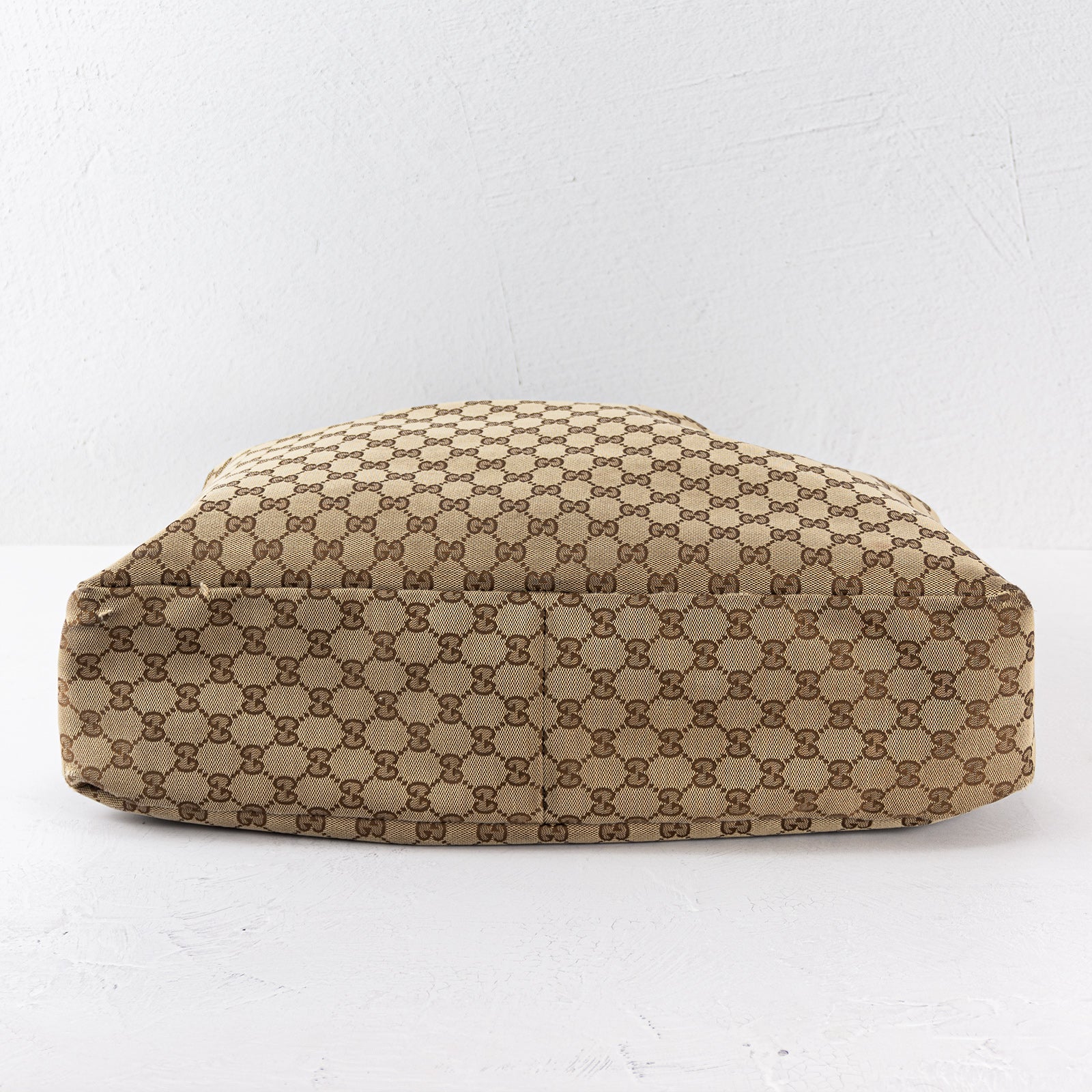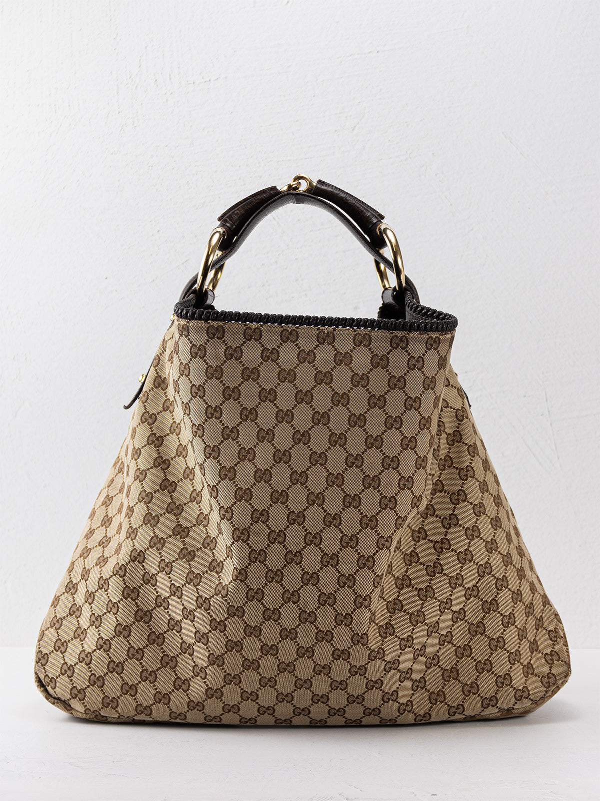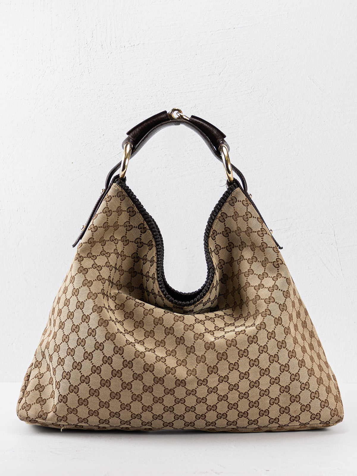 This Large Gucci Horsebit Hobo is crafted from brown GG canvas with light gold-tone hardware, leather trim and Horsebit accented shoulder strap. Twill lining with zipper pocket at interior and open top. Includes dust bag.