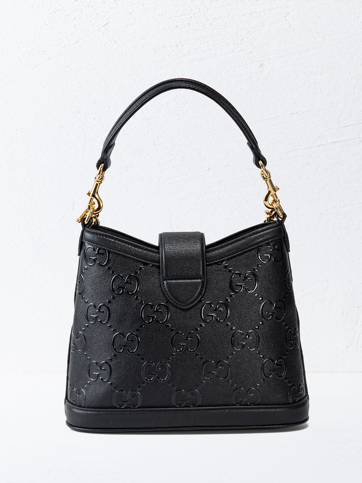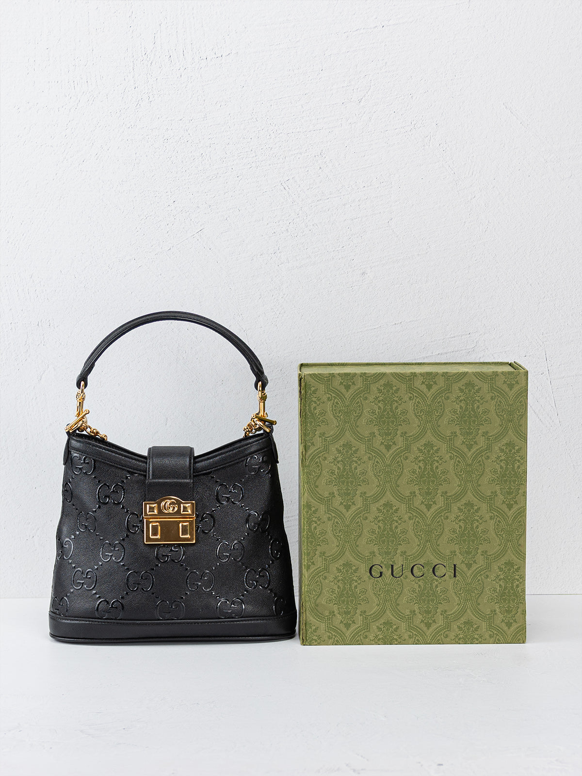 This Gucci Wonka Convertible Top Handle Bucket Bag is crafted from black GG embossed leather, with gold-tone hardware, chain-link shoulder strap and leather top handle. Grosgrain lining with zipper pocket at interior and push-lock closure at front. Includes dust bag and box.
