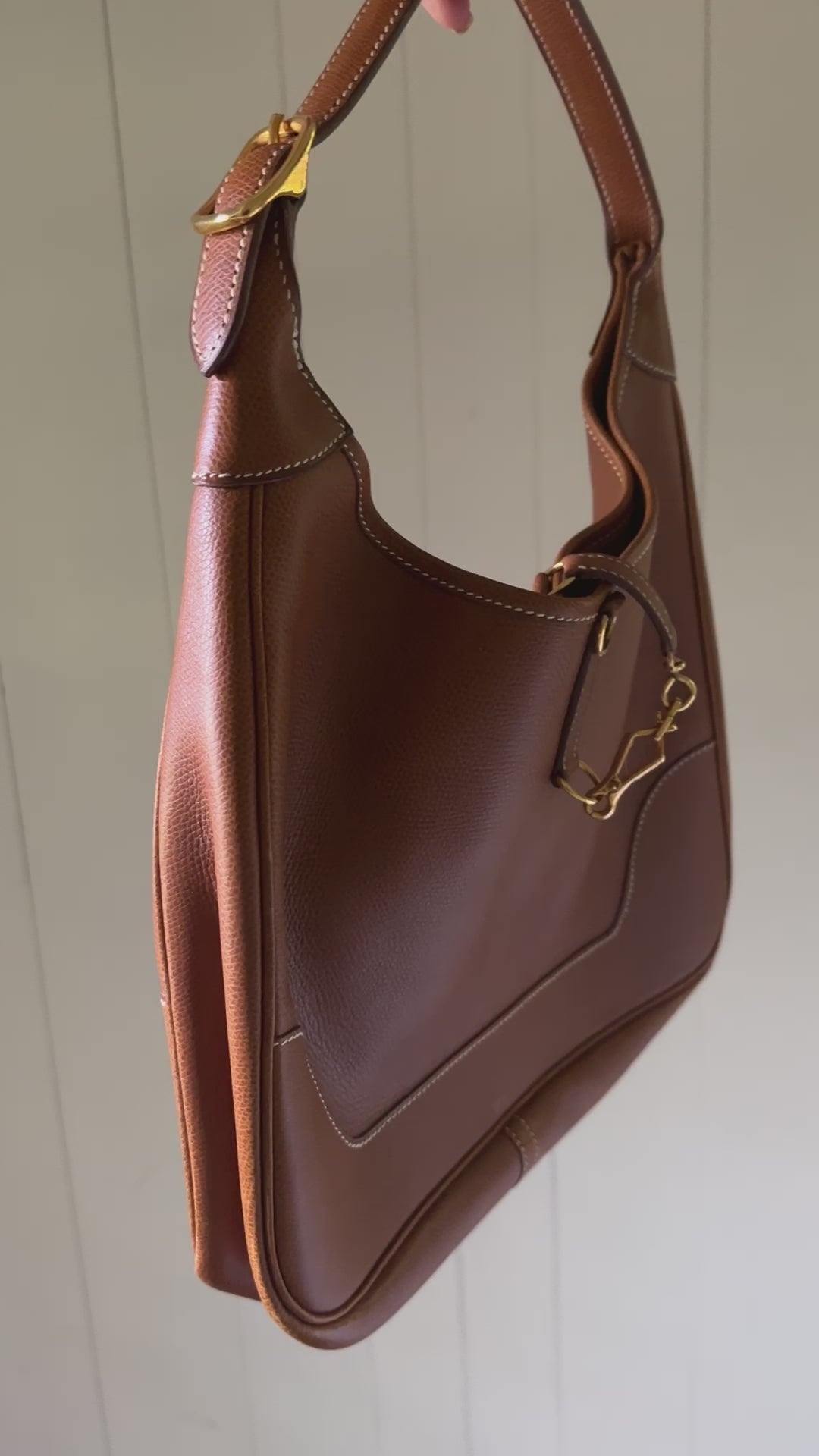 This vintage Hermès Trim 31 Hobo Bag is crafted from luxurious gold Epsom leather and is accented with gold-tone hardware. Featuring beautiful contrast stitching, trim closure at front and gusseted sides. Unlined interior. Includes box and ribbon.