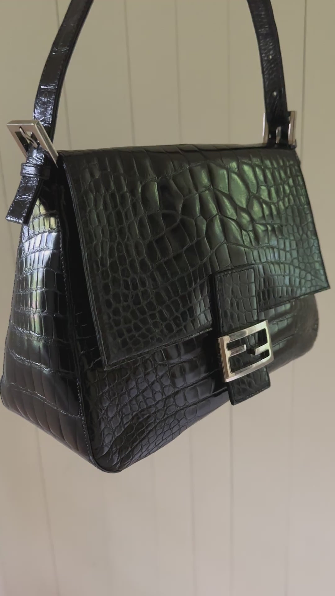 This Fendi Mama Forever Baguette is crafted from black Embossed Crocodile with silver tone hardware and a single shoulder strap. The interior features black satin lining with a zipper pocket and Fendi logo snap closure at front.